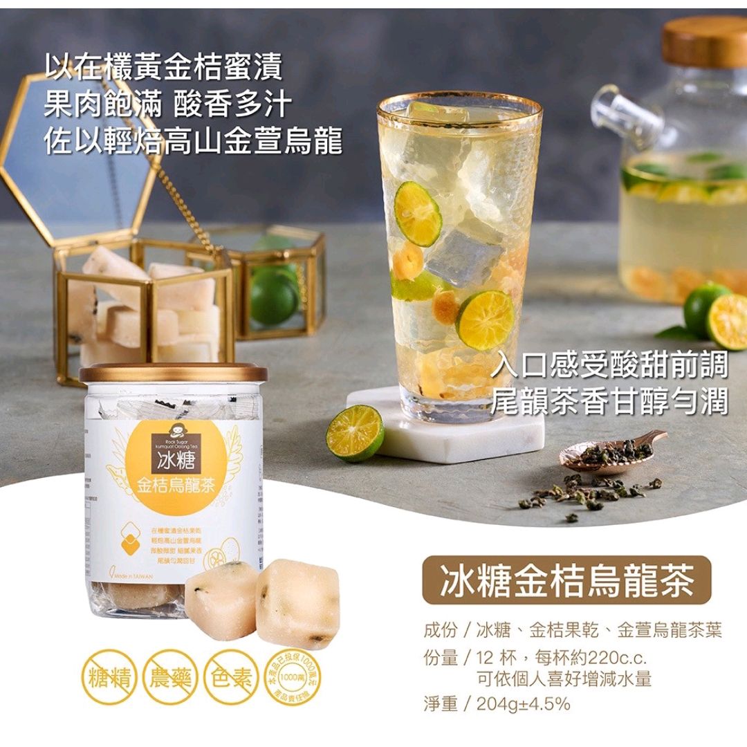 冰糖金桔烏龍茶 204g 截單日期:每月10,20,30 到貨日期:截單一個月 ⚠️貨期有早有遲 每罐含17g茶磚12入,12杯,每杯約220c.c.,可依個人後好增減水量,每入皆獨立包裝,安全衛生,攜帶方便。 成份: 冰糖、金柑果乾、金萱烏龍茶葉 特色: 在欉蜜漬金桔果乾,輕焙高山金萱烏龍,微酸微甜 細膩果香,尾韻勻潤回甘。 ✔台灣直購 會員價只供批發店主,需要提供証明方可享用會員價