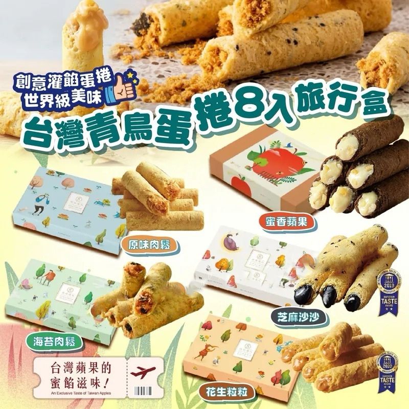 台灣青鳥旅行8入旅行盒 截單日期:19/12 到貨日期:1月尾 ⚠️貨期有早有遲 款式選擇: 芝麻沙沙蛋捲 微濕的芝麻醬結合酥脆的蛋捲,香味溫潤且醇厚,減糖配方更讓口感不過膩。 花生粒粒蛋捲: 使用香醇濃的花生醬,每口都能嚐到花生顆粒外,濃郁的花生香氣結合奶香餅皮,滋味更是鹹甜不膩。 產地:台灣 紙盒尺寸:24.5x15x4.5 cm 保存期限:生產日起計4個月 保存方式:避免陽光直射,請置於陰涼乾燥。 過敏原資訊:本產品含麩質之穀物、牛奶、蛋、大豆及其製品,不適合其過敏體質食用 📌落單備註註明款式 會員價只供批發店主,需要提供証明方可享用會員價