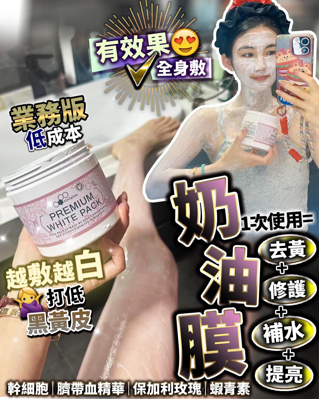 奶油膜 截單日期:20/10 到貨日期:11月尾 ⚠️貨期有早有遲 日本美容院激白療程,堅持用皮膚黃黚黚都變白雪雪,正宗係黃臉婆變白雪公主,全新升級版第三代奶油面膜,絕對係勝人一籌。 富谷含胱甘肽: 提亮膚色,抗氧化,修護。 高度濃維C: 淨化黑斷。 β-葡聚糖: 深層保濕,修復肌膚。 黃蠶金絲精提華取物: 讓你綻肌放膚,健康亮白。 美白保濕,修復肌膚,讓你膚肌更加柔軟、細膩、透亮,加入細胞賦能成分,從根本改善膚黑色素,幫助你脫黑。 潔清功能強,使用後膚變得常潔、純淨,毛孔變得乾淨、透亮。