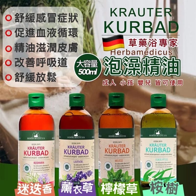 德國草藥浴專家Herbamedicus泡澡精油 截單日期:7/4 到貨日期:4月尾 ⚠️貨期有早有遲 可洗澡、泡澡兩功效,舒緩感冒症狀,促進血液循環,精油滋潤皮膚,改善呼吸道,舒緩放鬆,桉樹感冒、舒緩疲勞、改善乾燥,強大的消毒抗菌功能。 有高含量的抗氧化劑,舒緩疲勞倦怠,改善輕微感冒症狀、鼻塞、頭痛時,還能改善乾癢,給于乾燥皮膚需要的水份補充。 檸檬草抗菌、深層清潔,天天泡美容澡一定要選它,滋潤皮膚促進血液循環,深入毛細孔清潔肌膚,抗菌力一級棒,洗澡放鬆還能將細菌統統洗掉,純精油萃取清香舒適。 迷迭香平衡身心、瘦身,迷迭香的花和葉子具有優良天然的的抗氧化劑,能有效提神醒腦,歐盟草藥專家,經1萬名女性實驗對於肥胖也能達到瘦身效果,疫情待在家時間太長,洗澡時加一點瘦身+放鬆心情。 薰衣草舒緩、放鬆,可以幫助緩解生活上的壓力或是焦慮,薰衣草天然的香氛有助於,身心靈的放鬆,更可以達到舒緩頭痛,疲勞,失眠等症狀之效果。 使用方法: 身體浸濕後取適量產品於掌心均勻塗抹全身。 浴缸內倒入10-20C.C,泡10~15分鐘。 產地:德國 容量:500ml 保存期限:開封後1年 保存方式:避免陽光直射,請置於陰涼乾燥。 注意事項:請確保將產品放在嬰兒和孩童接觸不到的地方。 📌落單備註註明款式 會員價只供批發店主,需要提供証明方可享用會員價