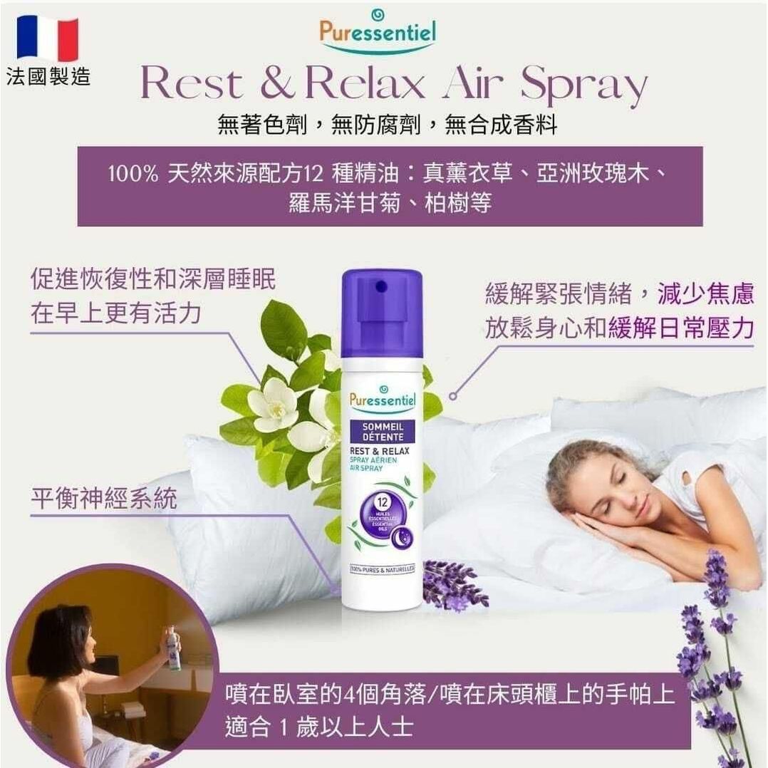 法國 PURESSENTIEL 舒緩助眠空氣噴霧 75ml 截單日期:14/7 到貨日期:9月頭 ⚠️貨期有早有遲 法國製造,法國璞醫香安神助眠空氣噴霧是一種100%天然的解決方案,可讓您為安寧、寧靜和安寧的夜晚做好入睡準備,有助放鬆情緒及緩解日常壓力。 安神助眠空氣噴霧由12種精油配製而成,100% 天然來源,不含染料、防腐劑和合成香料。 噴在臥室的4個角落,也可以噴在床頭櫃上的手帕上,為了在睡前促進放鬆。 改善睡眠困難,早喚醒,睡眠不安,失調,惡夢,促進深度睡眠,100%天然有效成份,含12種天然精油,適合1歲以上人士使用。 含 12 種天然精油,香味怡人,幫助快速入眠,減少焦慮及神經緊張,成分天然不會養成習慣。 使用方法: 晚上睡覺前噴於房間四角,噴於面紙上,將面紙放枕頭旁邊或床頭櫃上。 注意事項: 請勿在 1 歲以下嬰幼兒附近使用本噴霧。 使用後請等候 30 分鐘再讓兒童返回房間。 請勿用於孕婦或哺乳期婦女﹑有痙攣或癲癇病史的人士,或對精油過敏的人士使用。 對於兒童和正接受治療的人,請先咨詢健康專家建議。 只供外用。 避免接觸皮膚﹑眼睛和黏膜。 切勿吞食,遠離食物,飲料和動物飼料,可引致皮膚過敏。 會員價只供批發店主,需要提供証明方可享用會員價