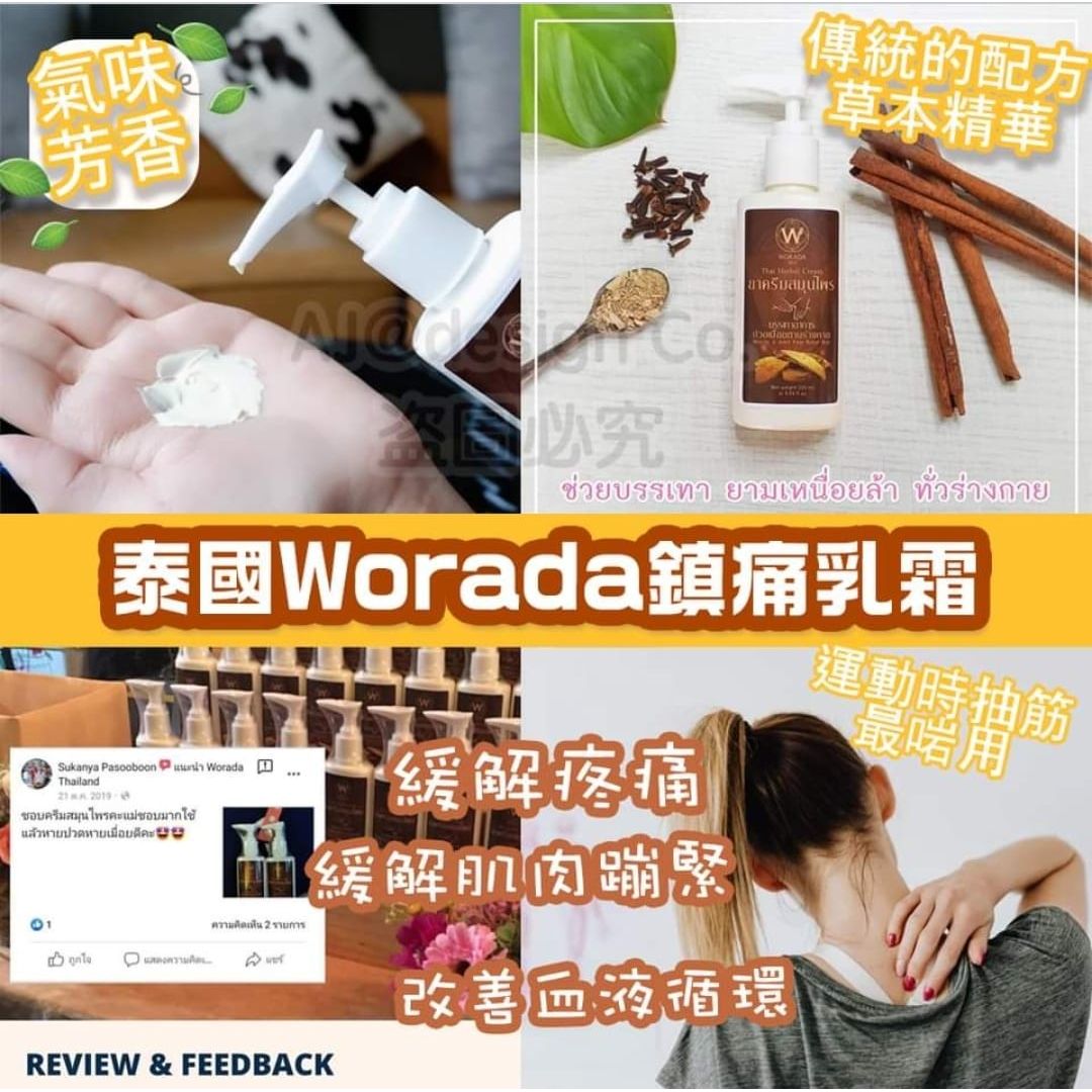 泰國 Worada鎮痛乳霜 120g 截單日期:30/11 到貨日期:12月尾 ⚠️貨期有早有遲 以傳統的配方將草本精華化,含有薄荷葉精華可有助迅速滲透發揮功效,溫熱膚感有助促進血液循環,能有效消除關節疲勞,放鬆肌肉繃緊狀態,舒緩酸痛感,氣味芳香,有時攰用佢嚟按摩下,放鬆肌肉都可以。 主要成份: 卡薩蒙納姜,姜黃,肉桂,薄荷葉精華。 緩解疼痛和腫脹,各種關節發炎,膝蓋痛,關節痛都適用,氣味芳香,可作放鬆肌肉及蹦緊,有助於拉伸纖維組織,改善血液循環。 2020 PM Award 保證(商務部優秀出口企業),有GMP和ISO認證。 會員價只供批發店主,需要提供証明方可享用會員價