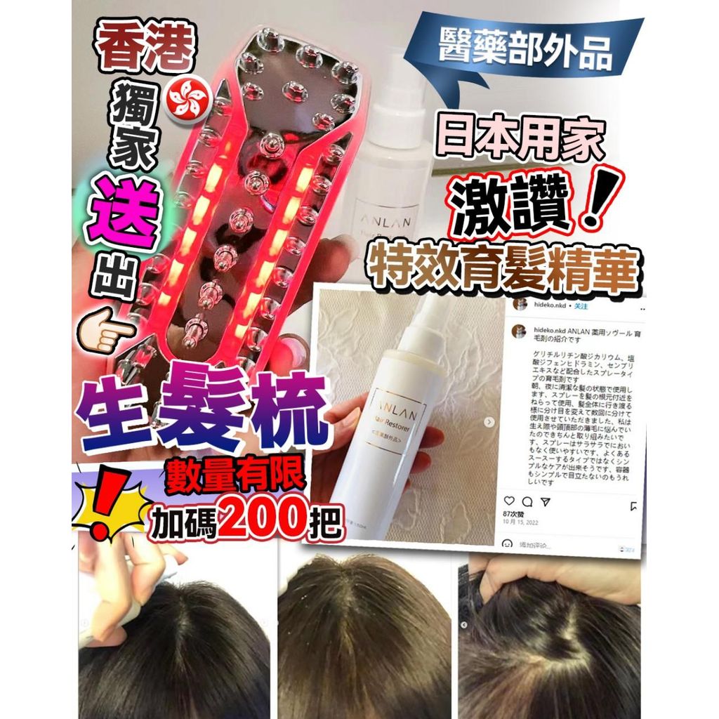 香港獨家送出生髮梳 截單日期:5/8 到貨日期:8月尾 ⚠️貨期有早有遲 日本用家激讚,特效育髮精華超好用,相信我,買到就真係賺左,日本育髮精華,真係好多人推介完全唔笠。 真係唔係講笑 日本對呢支特效育髮精華,評價超高,好評不斷。 頭髮稀疏欠自信,產後失掉狂甩髮,中年問題,髮際線煩惱,壓力內分泌一連串嘅脫髮情況,今次真係要頭髮有辦法。 每次將精華配置在生髮梳內配合使用,一邊出精華 一邊技術性刺激頭皮,一邊護髮,生髮效果超強,唔洗5舊水就搞掂,普遍2週內有效果。 日本進行咗100位民意調查,有90% 客人滿意,用家實証分享。 39歲男 2個月由頭髮稀疏變到超濃密。 30歲產後媽媽 內分泌失調,2星期見到明顯效果。 42歲女士 壓力影響狂甩髮,4星期重拾自信。 Anlan 特效育髮精華,獨研32種育發復合配方,促進外毛根鞘細胞的增值,加速修護毛囊,促進發根生長力,創新調配技術低溫及時製造法,還原成分生命力,同時有助抗菌、抗氧化,減少頭油、敏感痕癢、頭皮。男女老少皆宜。敏感肌可以用。 Agmo’C射頻生髮梳,採用RF射頻雙能激活,緩解頭皮緊張,打通皮膚吸收通道,加速血液循環,促進毛囊供氧,達到強健髮根,增髮效果。 同時設有高頻聲波震動及高頻低壓電脈技術,刺激到深層,毛囊,促進線粒體ATP合成,可激活休眠的生髮結構,減轉毛髮角蛋白紊亂,養髮同時提高有效成分的渗透效率,滋潤頭皮與毛賽,令髮質更柔韌有光澤。 使用方法: 早晚清潔頭髮後,抹走多餘水份,將精華利用附送試管裝入生髮梳容器內,打開電源,選擇模式,直接梳頭,建議可早晚使用或洗髮後使用5-10分鐘。 (剛開始使用時建議先選擇最低檔數測試頭皮合適度) 會員價只供批發店主,需要提供証明方可享用會員價