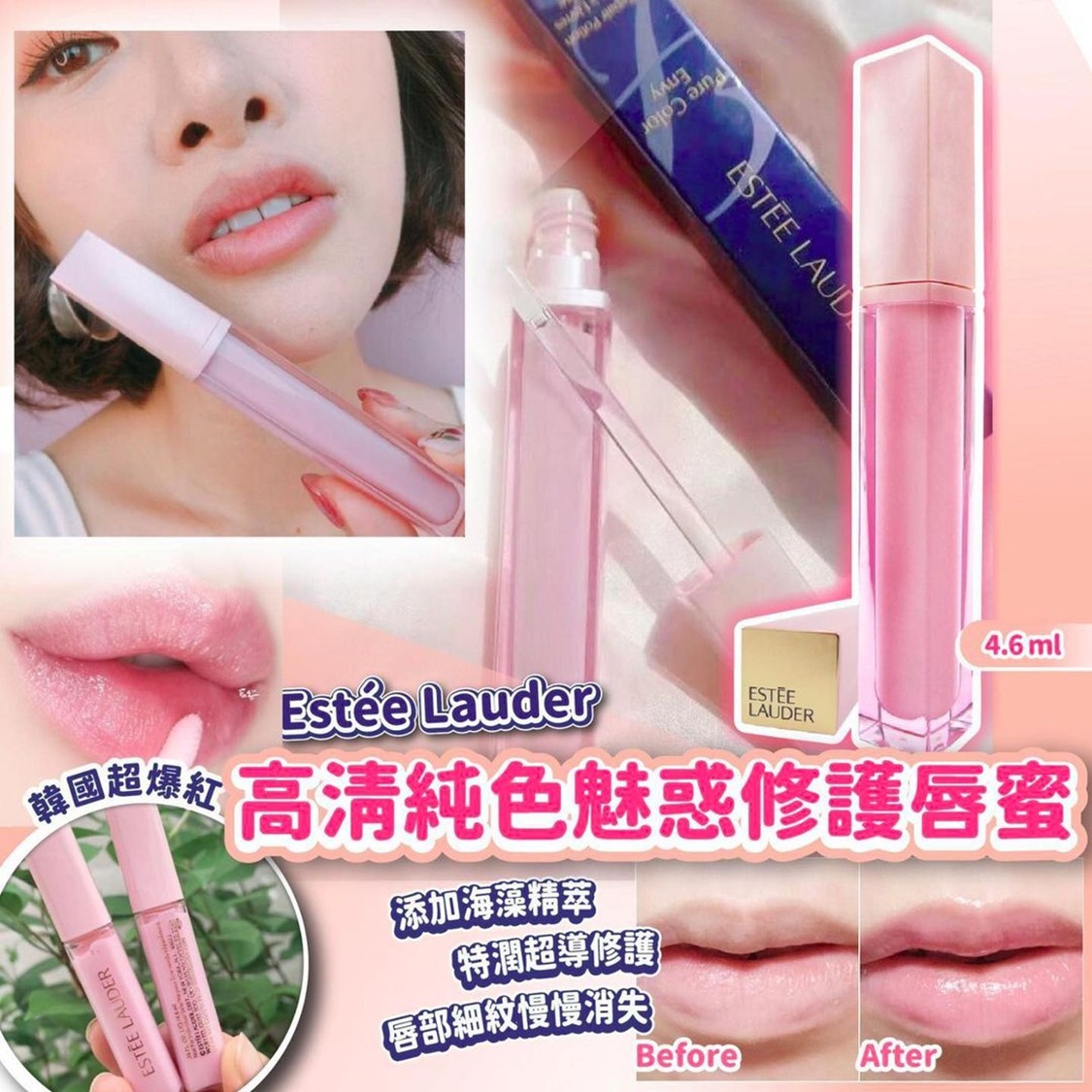 Estée Lauder 高清純色魅惑修護唇蜜 4.6ml 截單日期:28/8 到貨日期:9月尾 ⚠️貨期有早有遲 搽咗後就好似水蜜桃咁,水潤甜蜜又有光澤。 韓國超爆紅,網友譽為是唇界的修護「小棕瓶」,添加海藻精萃與特潤超導修護露中的明星「特潤修護精華」。 白天薄擦一層增加保水力,睡前於雙唇處厚敷當晚安唇膜。 針對唇部肌膚達到修復活化的功效,唇部回復光澤感,一覺醒來雙唇充滿潤澤感,持久使用,唇紋88。 有效深層滋潤雙唇,減輕脫皮情況,透亮粉色能中和任何唇色,美化雙唇的自然色調 約會前搽一搽,嘴唇好似啫喱咁,水潤通透,持久用完,唇部細紋慢慢消失,變到好似BB咁滑嫩,訓教前厚塗敷一敷,輕易保養嘴唇。 平時搽上嘴就好似搽咗唇膏咁,超自然又BlingBling咁。